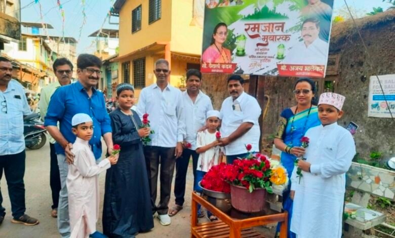 सामाजिक कार्यात नेहमी अग्रेसर असणारे चिपळूण लायन्स क्लबचे सदस्य नवनिर्वाचित नगरसेवक अजय भालेकर यांनी मुस्लिम बांधवांना सोबत घेत अनोख्या पद्धतीने रमजान ईद साजरी केली प्रत्येक मुस्लिम बांधवाला पुष्प देत ईदेच्या शुभेच्छा दिल्या यावेळी भेंडी नाका परिसर, मापारी मोहल्ला येथील हिंदू – मुस्लिम बांधव एकत्र जमले होते.हिंदू बांधवांनी मुस्लिम बांधवांना इदेच्या शुभेच्छा दिल्या प्रभाग क्रमांक चारच्या नगरसेविका वैशाली शिंदे ,नगरसेवक संजय गोताड, चिपळूण अर्बन बँक माजी संचालक विलास चिपळूणकर,पार्थ जागृष्ठे,सुरेश पाथरे, सचिन लकेश्री, संदीप मनोरकर, गणेश गांधी, प्रकाश साडविलकर,लवेश मापुस्कर, प्रसाद मापुस्कर, पंकज सावंत, उमर मिठागरी,मुराद कोकाटे,साजिद भाटकर, शकील भाटकर, नादीश उंडरे, शाहिद कुंडरे,तनवीर दळवी आदी हिंदू मुस्लिम बांधव मोठ्या संख्येने उपस्थित होते. या उपक्रमातून शिवसेना नगरसेवकांनी सामाजिक बांधिलकी जपली आहे.