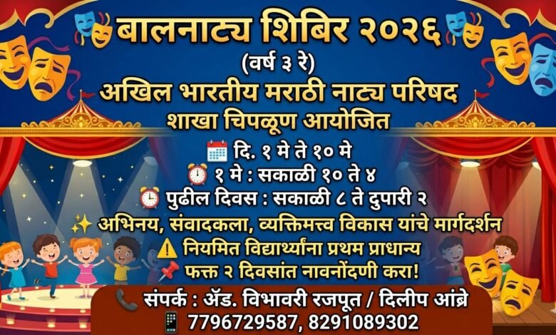 या शिबिरामध्ये मुलांना नाट्याभिनय, संवादफेक, आवाजाचा वापर, देहबोली, रंगमंचावरील वावर, समूह सादरीकरण, व्यक्तिमत्त्व विकास अशा विविध कलात्मक व उपयुक्त घटकांचे प्रशिक्षण दिले जाणार आहे. त्यामुळे मुलांच्या सर्वांगीण विकासासाठी हे शिबिर उपयुक्त ठरणार असल्याचा विश्वास आयोजकांनी व्यक्त केला आहे.यंदाच्या शिबिरासाठी प्रवेश मर्यादित असल्याने नियमितपणे शिबिरात सहभागी होणाऱ्या मुलांना प्रथम प्राधान्य देण्यात येणार असल्याचे स्पष्ट करण्यात आले आहे. त्यामुळे इच्छुक पालकांनी पुढील दोन दिवसांत आपल्या मुलांची नावनोंदणी करून प्रवेश निश्चित करून घ्यावा, असे आवाहन करण्यात आले आहे.शिबिराच्या वेळापत्रकाबाबत माहिती देताना आयोजकांनी सांगितले की, दि. १ मे रोजी शिबिराची वेळ सकाळी १० ते सायंकाळी ४ अशी राहणार आहे. त्यानंतर नेहमीप्रमाणे दररोज सकाळी ८ ते दुपारी २ या वेळेत शिबिराचे सत्र होणार आहे.गेल्या दोन वर्षांत या बालनाट्य शिबिराला चिपळूण व परिसरातील पालक आणि विद्यार्थ्यांकडून उत्स्फूर्त प्रतिसाद मिळाला होता. अनेक मुलांनी या शिबिरातून रंगभूमी, अभिनय आणि सांस्कृतिक उपक्रमांमध्ये सक्रिय सहभाग घेत आपली कला खुलवली आहे. त्यामुळे यंदाच्या तिसऱ्या वर्षीही या शिबिराबाबत मोठी उत्सुकता निर्माण झाली आहे.बालकांच्या सुप्त कलागुणांना योग्य व्यासपीठ मिळावे, त्यांच्यात सांस्कृतिक जाण निर्माण व्हावी आणि रंगभूमीशी त्यांचा जवळचा संबंध निर्माण व्हावा, या उद्देशाने हे शिबिर सातत्याने राबवले जात असल्याचे आयोजकांनी सांगितले.